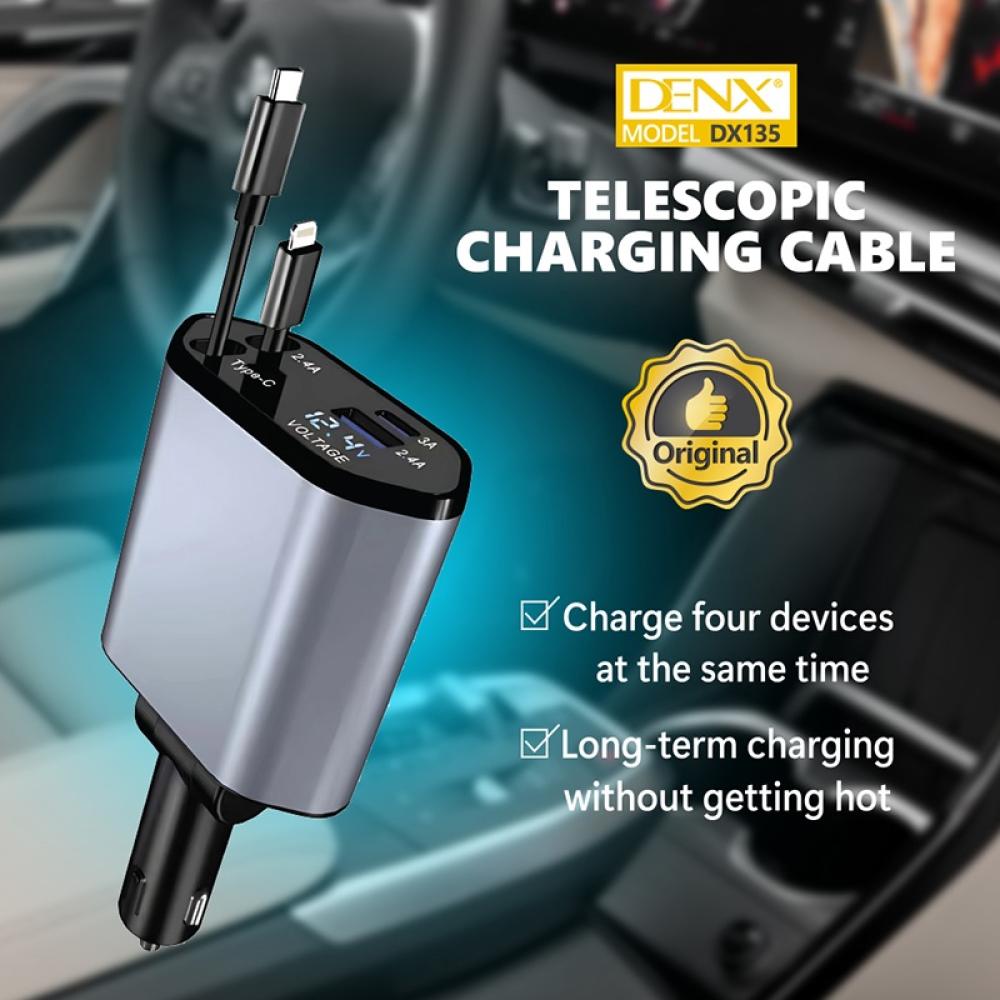 اشحن حتى 4 أجهزة في نفس الوقت مع شاحن السيارة الذكي من DENX، المصنوع من مواد عالية الجودة (ABS + PC مع طلاء كهربائي) والمزود بكابل تلسكوبي بطول 80 سم لتوفير أقصى راحة وسهولة في الاستخدام داخل السيارة.